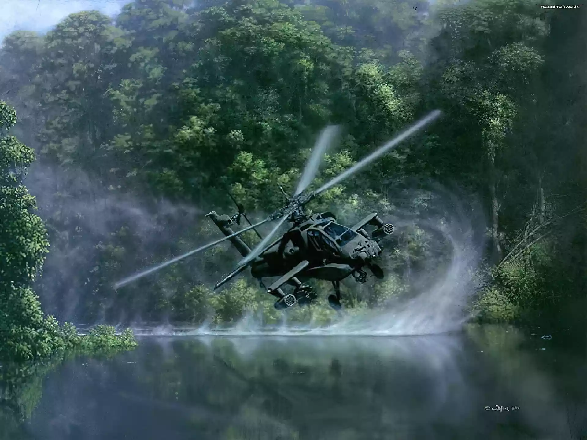 Pojazdy Militarne, Helikopter Apache, rzeka, las